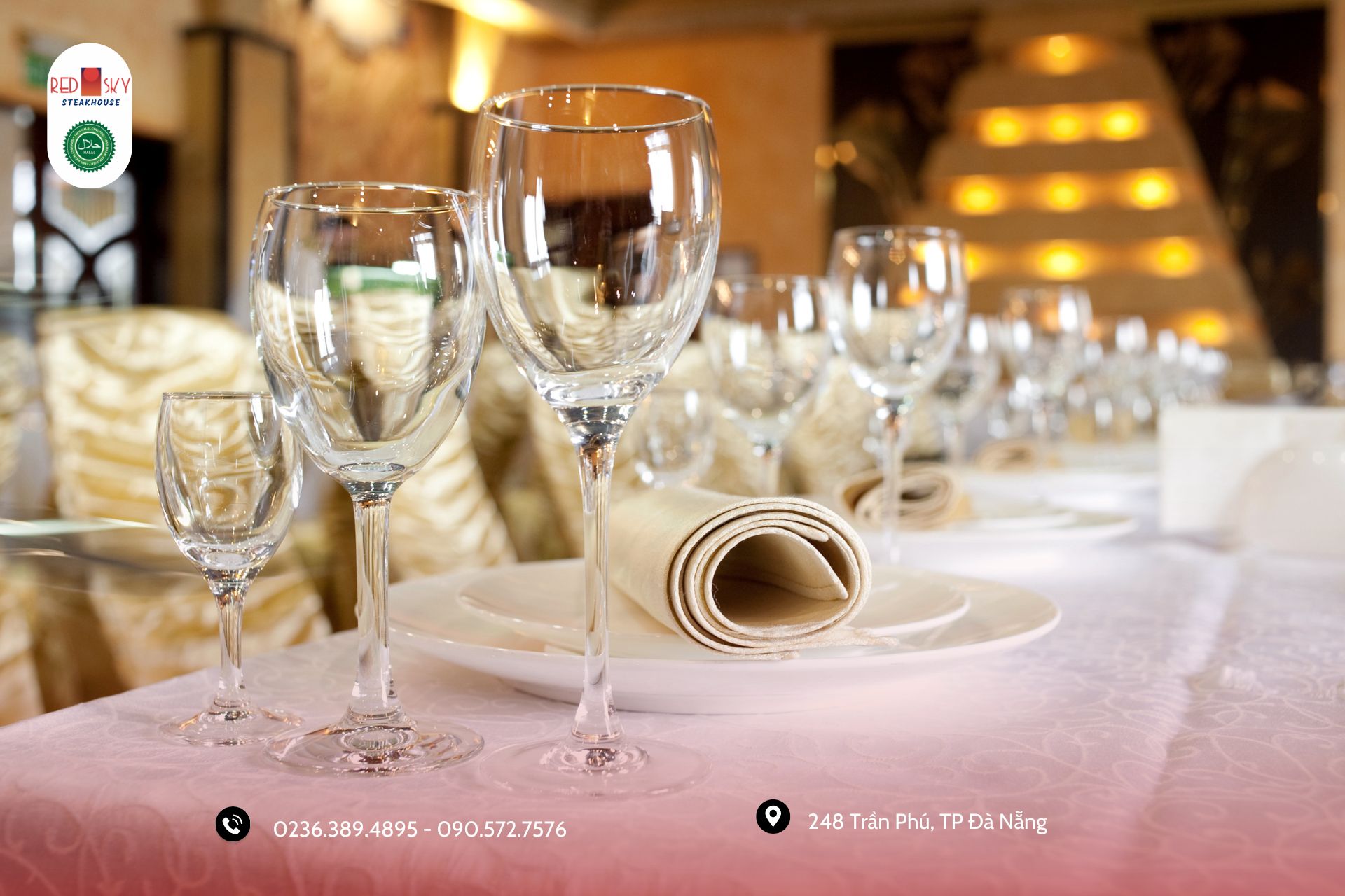 The table setting at RedSky is also meticulously designed, with warm lighting, fine wine glasses, polished cutlery, and elegant tablecloths that create a professional dining space, elevating the overall culinary experience.